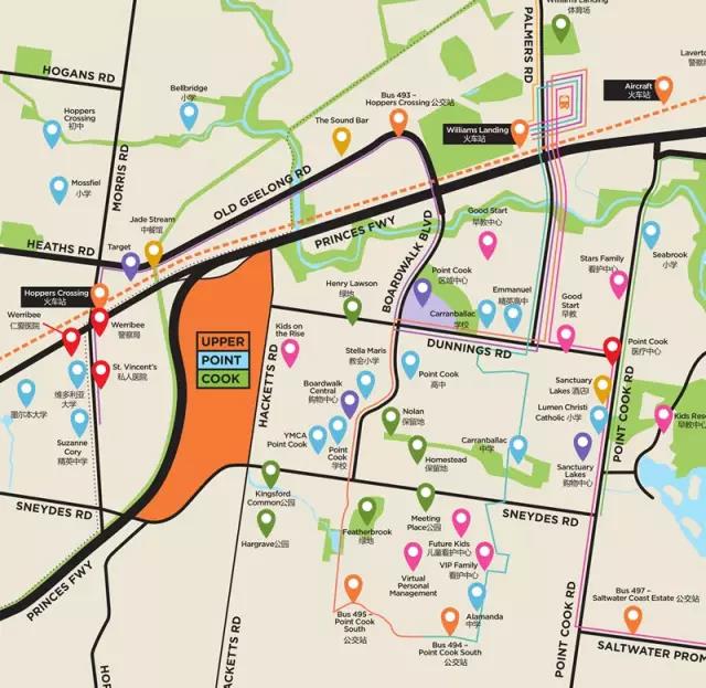 Upper PC社区位于East Werribee超级城区的核心地带,毗邻M1高速公路和Hoppers Crossing 火车站,开车或乘坐火车直达墨尔本市中心仅需要30分钟左右。从社区步行15分钟左右即可到达墨尔本大学和维多利亚大学分校区。周边设施完善,医院、商场、公园及娱乐设施一应俱全,距离Point Cook城镇中心也仅仅数步之遥。